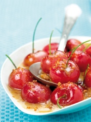 Servez aussitôt en parsemant le reste de pain d'épices grillé sur les cerises.