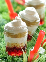 Garnir le fond d'une fine couche de Fruitée Intense Cerise, disposer une couche de palets bretons effrités, une couche de mousse au yaourt, une couche de Fruitée Intense Rhubarbe et finir par une couche de mousse au yaourt.