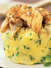 Dans une casserole, faire réchauffer la purée de pommes de terre sur feu doux avec 5 cuillerées à soupe d'huile d'olive, la ciboulette, 2 cuillerées à soupe