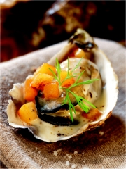 Déposez dans chaque fond de coquille une cuillère à café de crème fraîche et une huître puis quelques dés de pommes.
