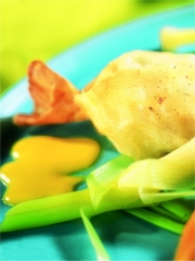 Papilottes croustillantes de petits merlans farcis à la purée d'ail, jeunes légumes, sauce bourride à l'huile d'olive Olï