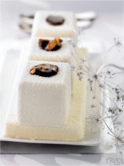 Aussi graphique qu’immaculé, ce dessert inédit se compose d’une succession de trois cubes de