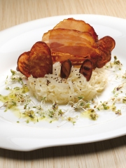 Ingrédients : 600 g de choucroute cuite 120 g de lard fumé 1 saucisse de Morteau 80 g de cervelas 120 g de filet de Kassler ou de rôti de porc fumé 2 saucisses de Strasbourg 40 g de beurre cidre brut sec graines de moutarde vinaigrette jeunes pousses de moutarde sel poivre
