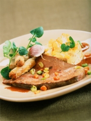 Recette Foie de veau de lait, piqué au gras de jambon, macaroni truffés, cresson et chou-fleur gratiné