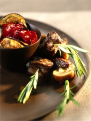 800 g de hampe 8 longues branches de romarin 300 g d'aubergines 240 g de courgettes 1 poivron rouge 200 g de tomates olivette huile d'olive sel poivre