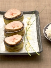 Étaler les tranches d'aubergine en les juxtaposant, y déposer les filets mignons et les enrouler dans les aubergines.
