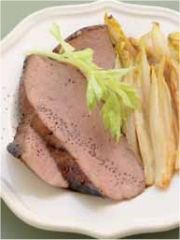 600 à 800 g de foie de veau en un seul morceau 2 cuillères à café de miel cannelle 4 belles endives 2 branches de céleri 50 g de beurre ½ citron 20 g de sucre semoule 1 cuillère à soupe d'huile d'arachide sel poivre