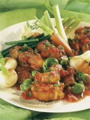 1 kg de bas de carré et tendron de veau 200 g de carottes nouvelles 50 g de petits oignons nouveaux 4 petits fenouils 200 g de fèves fraîches 100 g de navets nouveaux 200 g de petits pois 100 g de haricots verts sel, poivre 4 grosses tomates 2 gros oignons 2 gousses d'ail 1 bouquet garni herbes fraîches : (basilic, ciboulette, coriandre) 3 cuillères à soupe d'huile beurre et farine