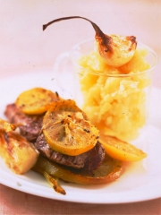 4 onglets de veau de 150 à 200 g 4 citrons confits 1 tête d'ail 4 cuillères à soupe d'huile d'olive 6 grosses pommes de terre à chair ferme sel poivre
