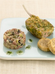 4 côtes d'agneau premières 400 g de filet d'agneau 50 g d'olives dénoyautées et hachées 50 g de cornichons hachés 50 g de câpres hachés 2 échalotes ciselées chapelure 1 bouquet de coriandre fraîche 1 bouquet de basilic 1 bouquet de persil plat moutarde forte huile d'olive fleur de sel