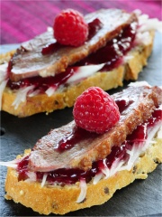 4 tranches de pain aux céréales 2 petits magrets de canard 4 cuillères à café de Confiture de Framboises Bonne Maman 1 radis noir 2 échalotes 2 cuillère à soupe de sauce soja sel poivre quelques framboises pour la décoration