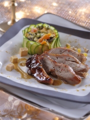 Servir les cuisses de dinde tranchées avec une dariole de légumes et napper de sauce au foie gras.