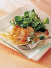 Disposer la mâche sur assiette et ajouter les poivrons et le carpaccio de haddock.