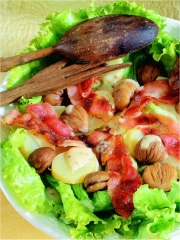 1 boîte 1/2 (240 g) de marrons sous vide Clément Faugier 2 pommes de terre (type Charlotte) 4 tranches fines de poitrine de porc 1 salade batavia huile vinaigre sel poivre