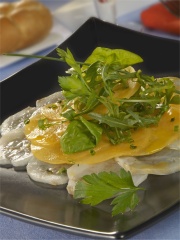 Sur une assiette, dresser le carpaccio, une rondelle de morue, une rondelle de Persimon et renouveler l'opération.