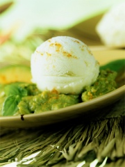 ½ litre de sorbet citron vert 4 avocats 4 pincées de curry le jus d'un citron 1 pincée de piment de Cayenne quelques feuilles de basilic sel