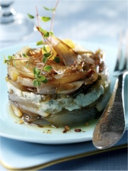 Dans chaque cercle, tasser une couche d'échalotes, ensuite une couche de roquefort et terminer par une couche d'échalotes confites.