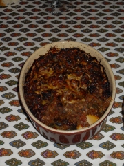 Mettez dans un plat en terre allant au four, saupoudrer de fromage rapé (emmental) et passer quelques minutes à four chaud pour faire gratiner légèrement.