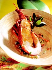 Couper les langoustes en deux (de préférence avec un long couteau scie) et les servir dans de grandes assiettes à potage accompagnées de la garniture, du jus et des herbes hachées.