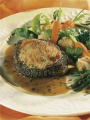 Ingrédients pour le veau : 4 grenadins de veau de 180 g chacun 2 cuillères à soupe de graines de pavot 20 cl de fond de veau 1 cuillère à café de grains de café pilés 5 cl de vinaigre de Xérès 200 g de beurre sel poivre
