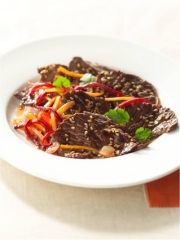 Couper l'onglet en fines tranches, les arroser avec une cuillerée de sauce soja, assaisonner.