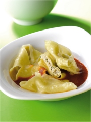 Servez 3 ravioles par personne avec un coulis de tomate à l'huile d'olive et au basilic frais.