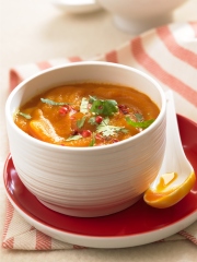 Versez dans de petits bols et disposez la coriandre ciselée et quelques baies roses sur le dessus.