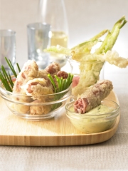 20 chipolatas 2 bottes de cebettes 1 sachet de pâte à tempura prête à l'emploi (ou pâte à beignet très fine et lisse) 100 g de purée de raifort 1 tube de wasabi (facultatif) estragon ciselé aneth ciselé cive ciselée