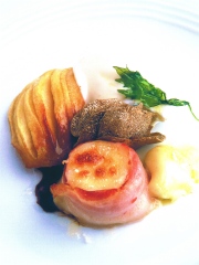 240 g de fromage Majorero 4 tranches fines de poitrine fumée 2 petites pommes rainettes 2 cuillères à soupe de sucre 2 cuillères à soupe de vinaigre balsamique 2 cuillères à soupe de miel 4 oeufs de caille pochés lamelles de truffe d'été (facultatif)